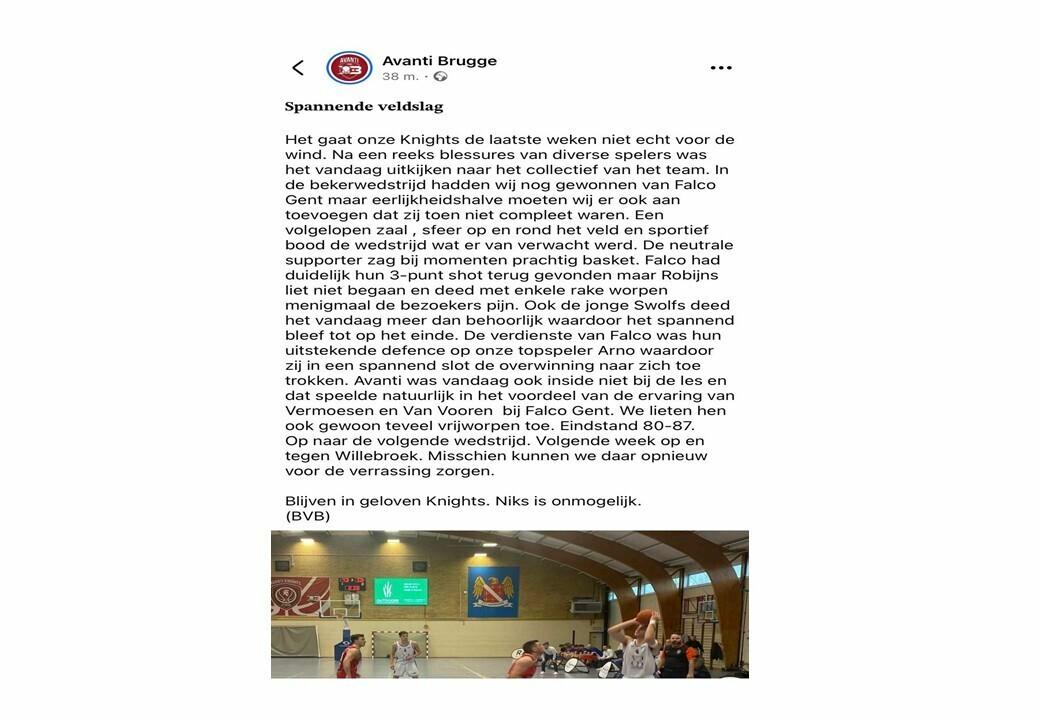 : FALCO A WINT ZESPUNTENWEDSTRIJD OP AVANTI BRUGGE : 80-77 - ERVARINGRIJK RACING BRUGGE KLOPT NIPT FALCO B : 60-63 - VLOTTE ZEGE VOOR FALCO C TEGEN HOUTEM B : 79-65 - MOOIE ZEGE VOOR FALCO D OP BAASRODE C : 82-90 - RUIME FALCONS-ZEGE TEGEN FENIKS -